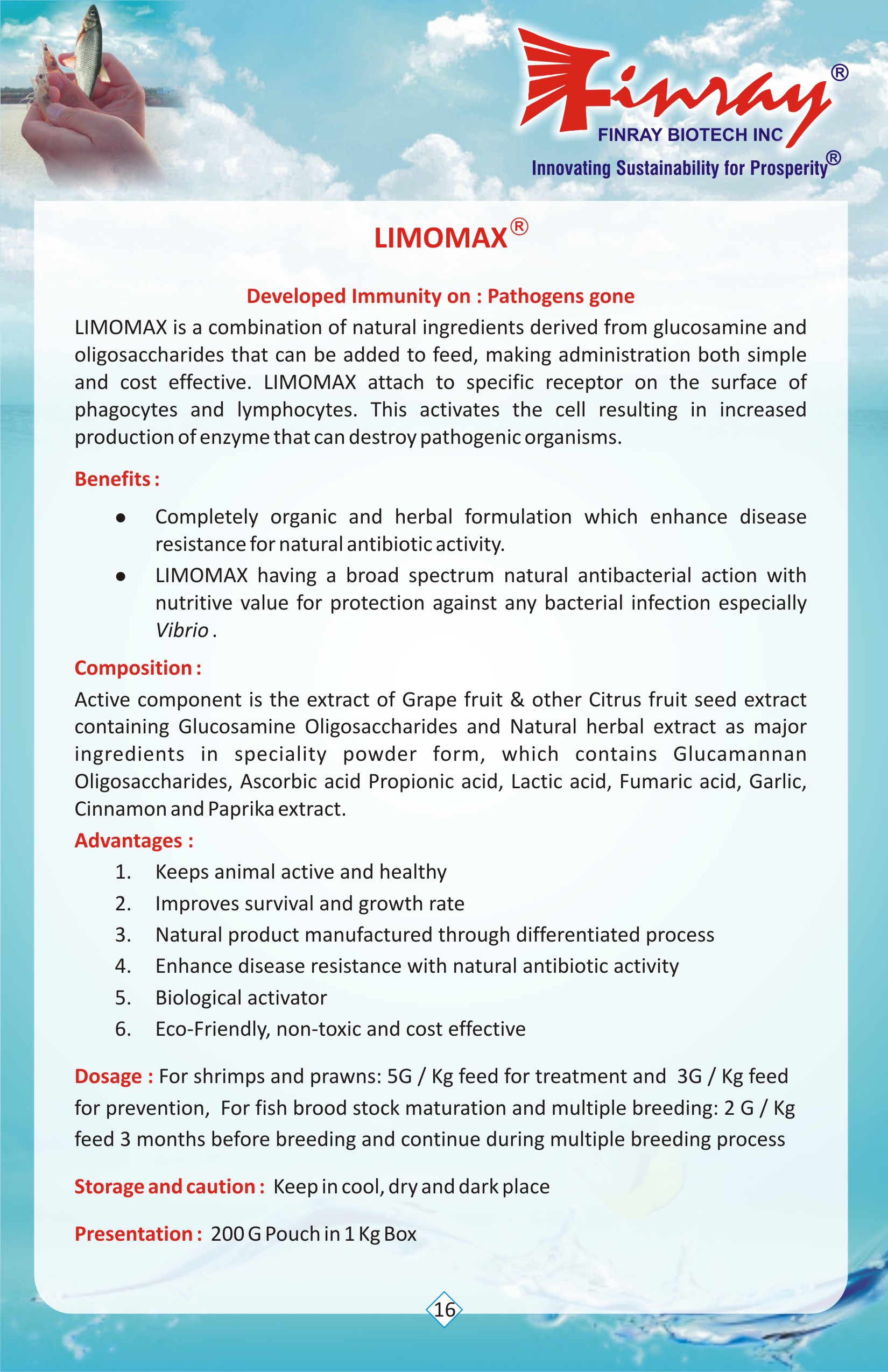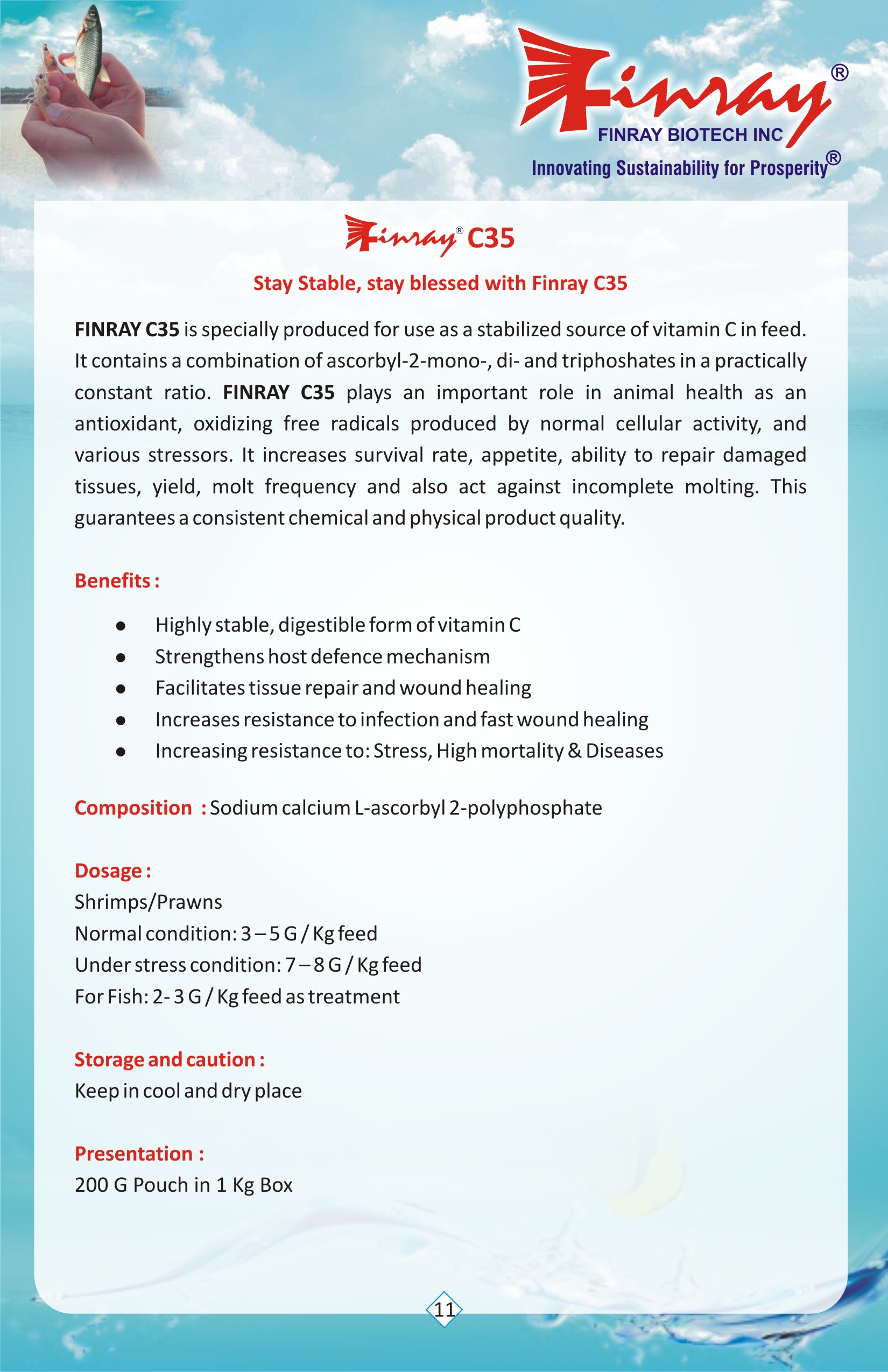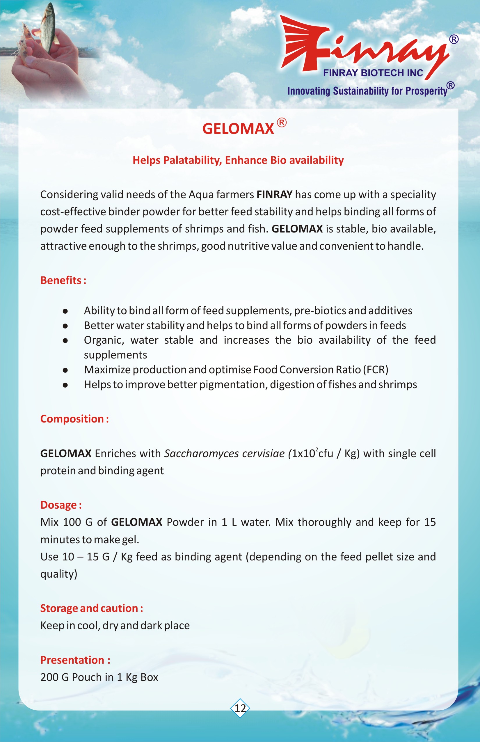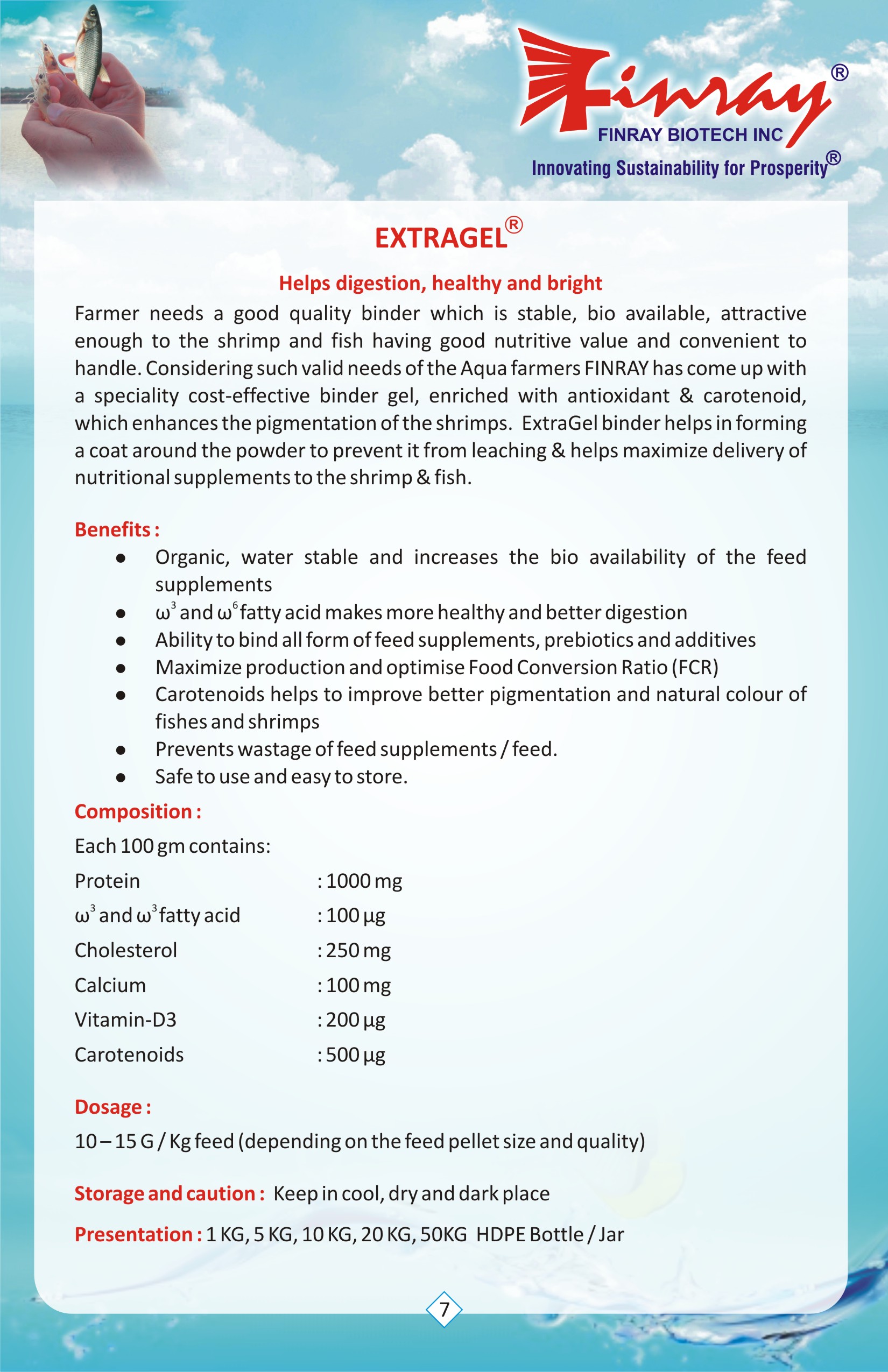 Farmer needs a good quality binder which is stable, bio available, attractive enough to the fish, good nutritive value and convenient to handle. Considering such valid needs of the Aqua farmers Finray has come up with a speciality cost-effective Feed Binder, supplements and Specialty products.