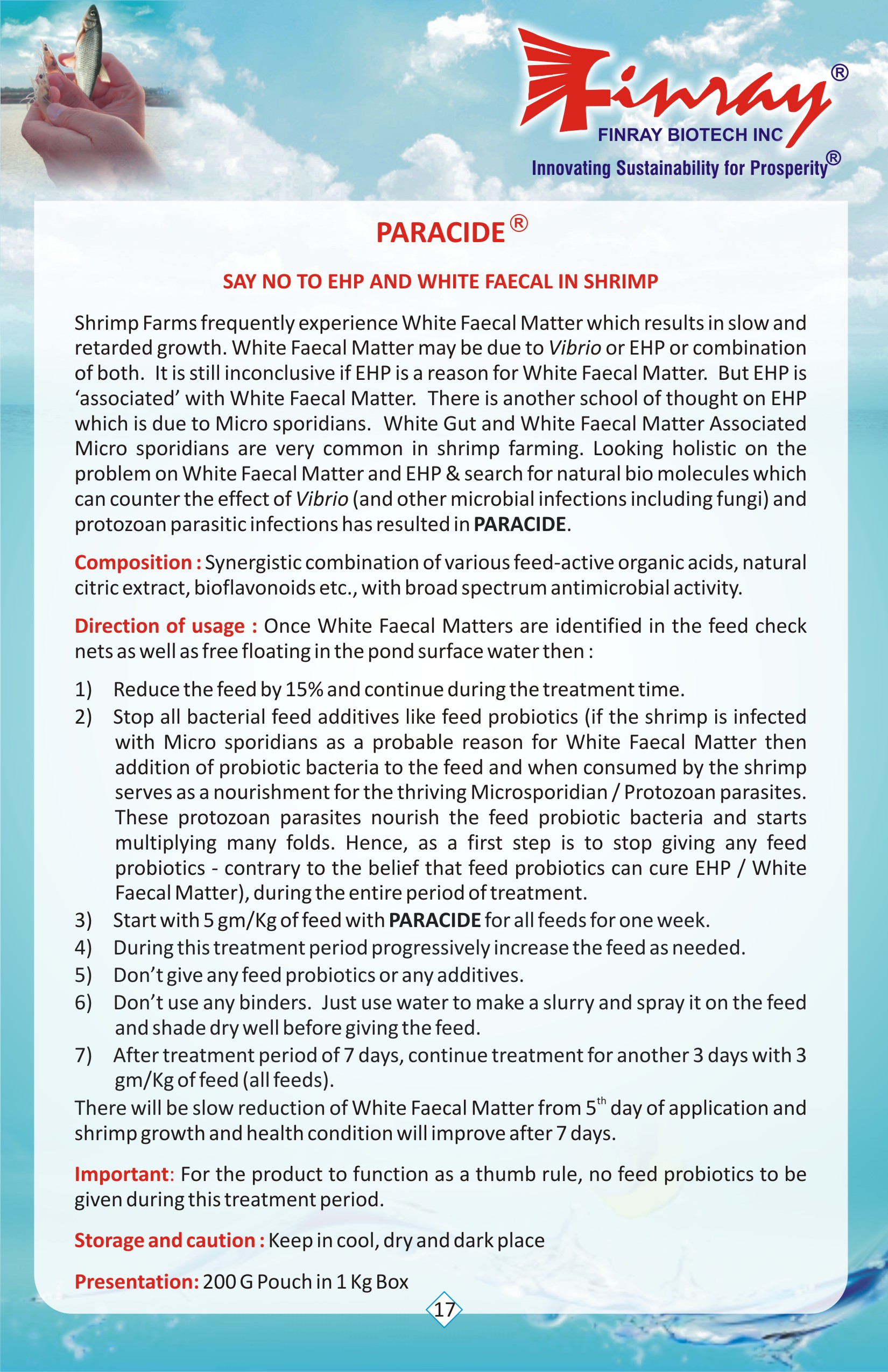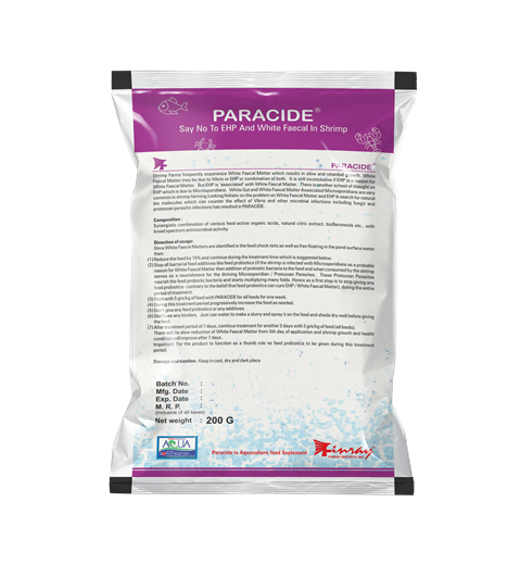 Shrimp Farms frequently experience White Faecal Matter which results in slow and retarded growth. White Faecal Matter may be due to Vibrio or EHP or combination of both. It is still inconclusive if EHP is a reason for White Faecal Matter. But EHP is ‘associated’ with White Faecal Matter. There is another school of thought on EHP which is due to Microsporidians. White Gut and White Faecal Matter Associated Microsporidians are very common in shrimp farming. Looking holistic on the problem on White Faecal Matter and EHP & search for natural bio molecules which can counter the effect of Vibrio and other microbial infections including fungi) and protozoan parasitic infections has resulted in PARACIDE